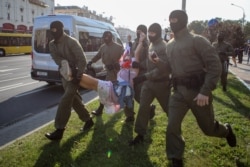 В Минске снова была задержана пенсионерка и активистка Нина Багинская, ставшая символом протеста. Когда ее отводили в автобус, люди кричали: "Позор!" Позже Багинскую отпустили, однако сняли бело-красное-белое полотнище с древка флага, с которым она в субботу протестовала.